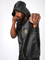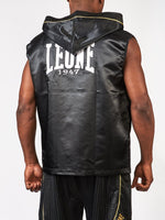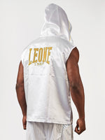 Portez le Débardeur de ring Leone Premium et faites votre entrée sur le ring avec grand style. Idéal en combinaison avec les Shorts de la ligne Premium, le débardeur AB261 est réalisé dans un tissu mélangé de polyester et satin, brillant et doux sur la peau. Le logo et les détails dorés embellissent le vêtement sur la partie avant et sur la capuche, le rendant parfait pour les boxeurs qui aiment l'élégance et le raffinement.